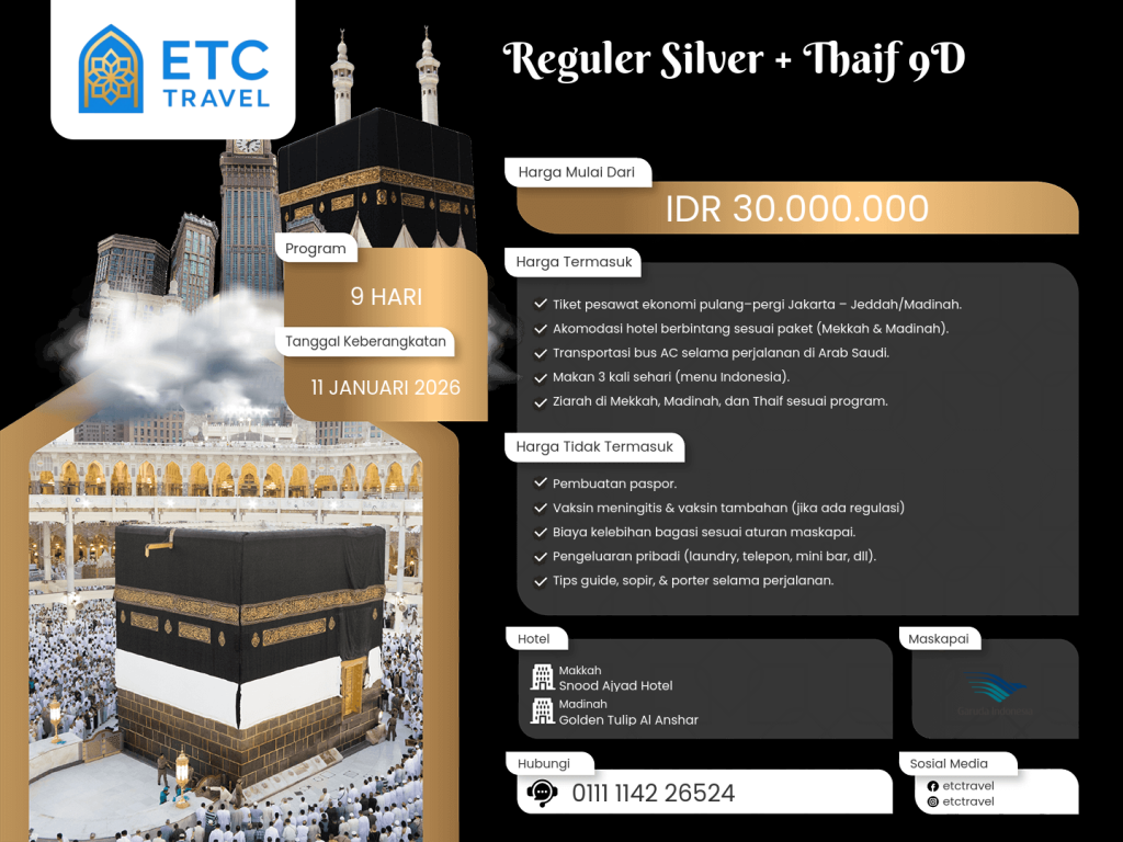 - Harga paket dapat berubah sewaktu-waktu menyesuaikan kebijakan maskapai, hotel, dan regulasi pemerintah Saudi maupun Indonesia.